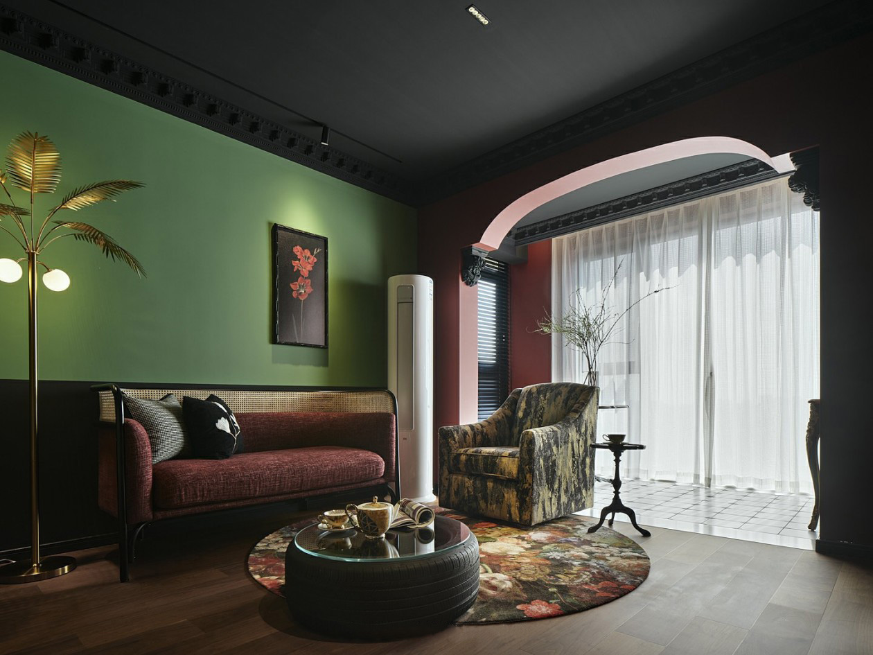 大胆的配色,浓郁且古典,展现出复古风潮,让人切实感受到屋内的生命力,唤醒内心对丛林秘境的向往。茂盛的棕榈树落地灯,达成“以光会友,制造出理想的对话情境,疏解了客餐厅紧贴的局促感。
